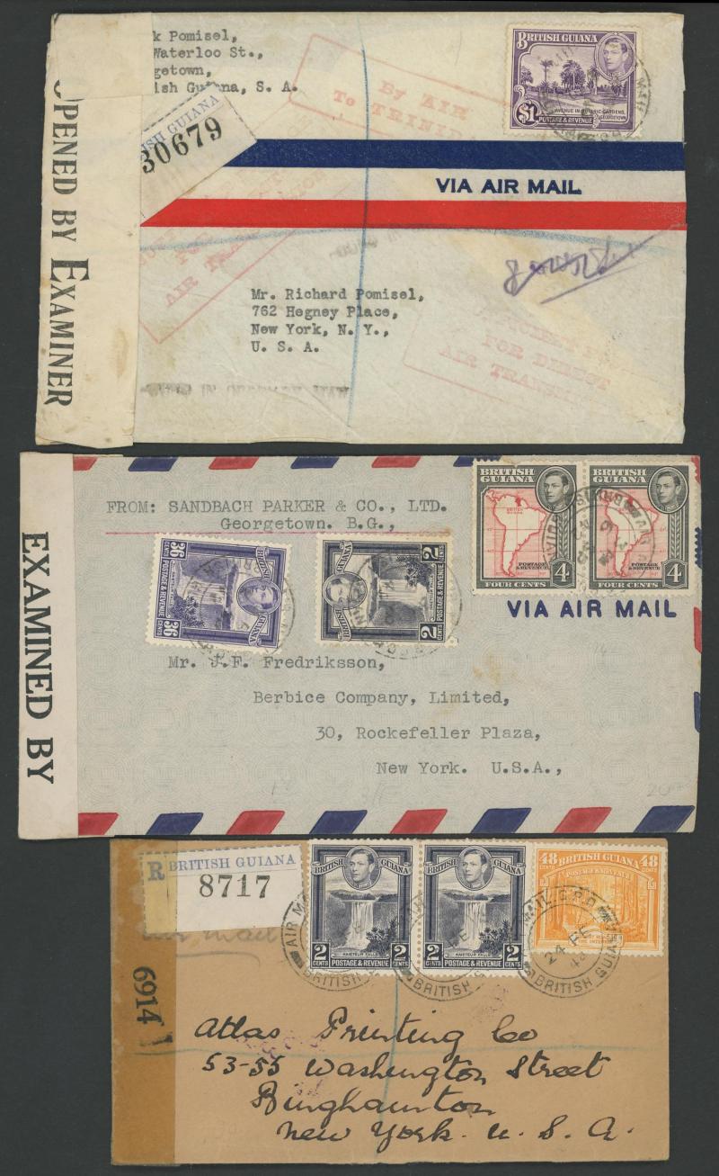 including 1932 registered to GB with DLR 60c plus Centenary 2c and boxed 'TO NEW YORK ONLY/BY AIR' cachet in violet, 1936 to GB at 42c rate with the same cachet in red, World War II to USA at 46c x2 (one of '21DE/41' not censored) or 46c plus 6c