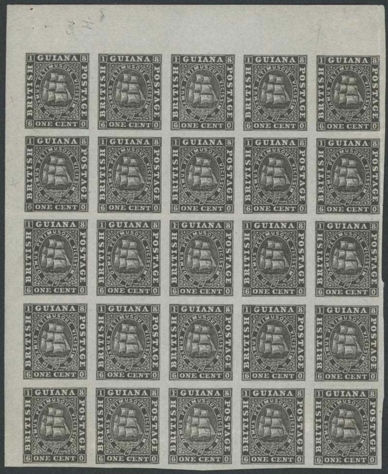 1863-76 Ship New Transfers 1c imperforate plate proof block of 25 from the upper-left of the sheet from the Fourth Setting