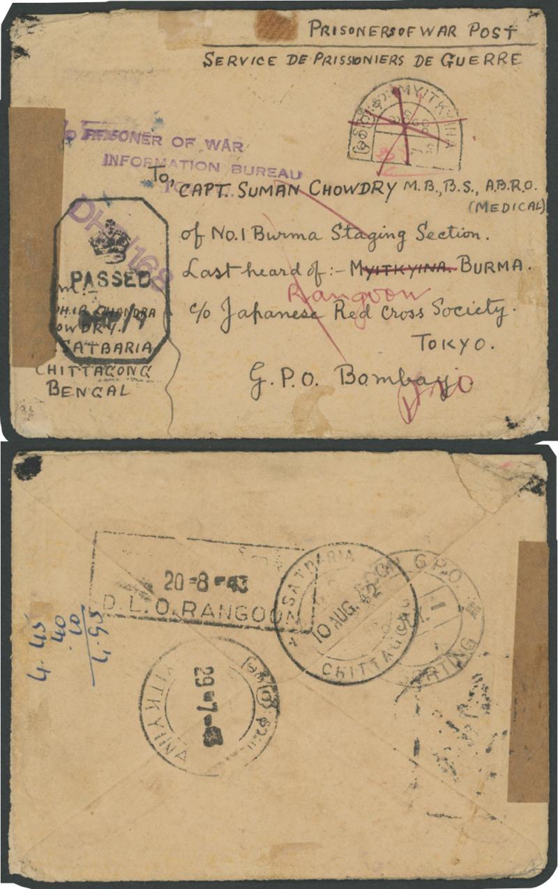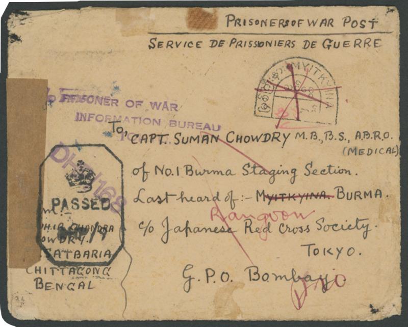 (Medical), of No.1 Burma Staging Section, Last heard of: MYITKYINA, BURMA, c/o Japanese Red Cross Society, Tokyo", censored at Bombay with 'DHB/168' cachet, presumably where the 'C/O PRISONER OF WAR INFORMATION BUREAU TOKYO' handstamp in the same ink