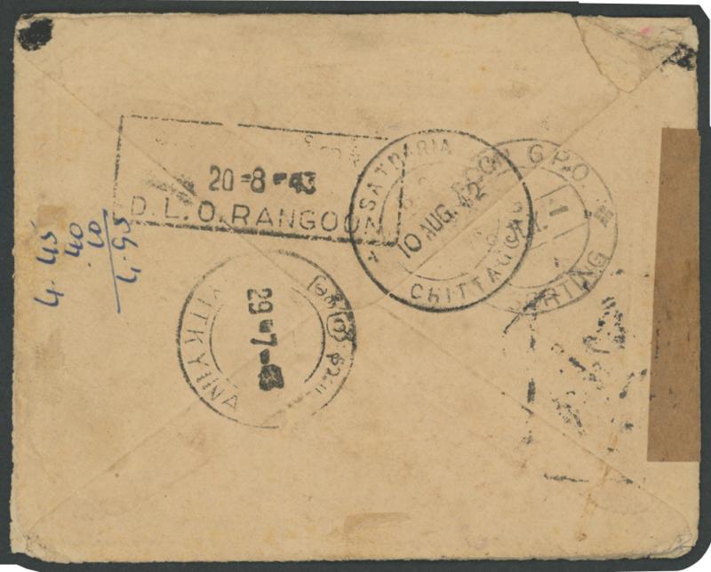 POSTAL HISTORY: 1942 (Aug 10) Japanese Occupation unfranked cover from Chittagong, Bengal, India addressed to "Capt Suman Chowdry
