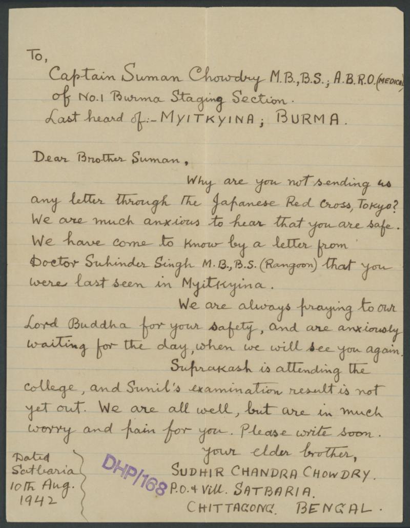 is assumed that only one batch was despatched". The enclosed letter from his brother with the same censor cachet states in part "We have come to know by a letter from Doctor Suhinder Singh MBBS (Rangoon) that you were last seen in Myitkyina ..."