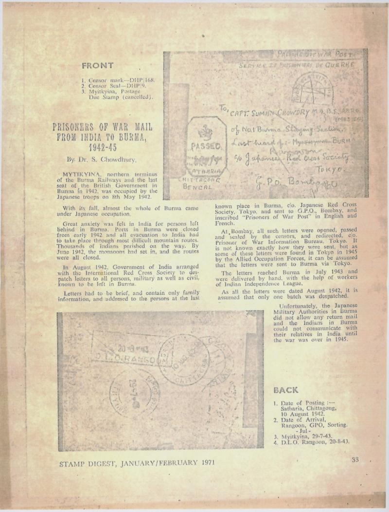 David Tett at p9-12 illustrates three similar items - none of which show any evidence of having reached Burma - and quotes an article by Dr S Chowdhury in the Stamp Digest (Calcutta) of Jan-Feb 1971 [a photocopy - illustrating this item - is included