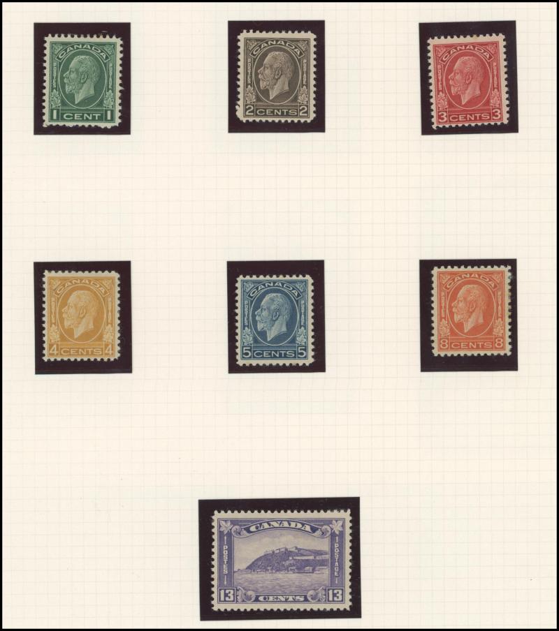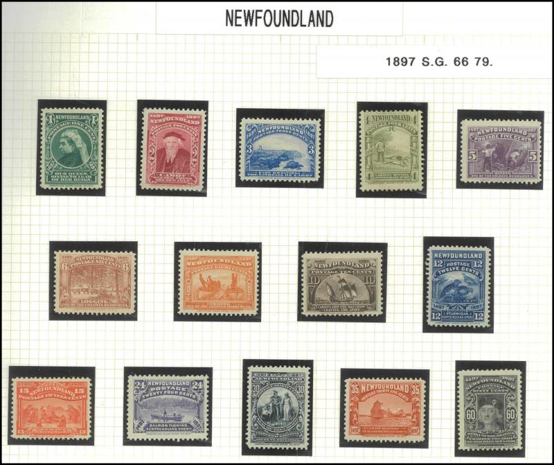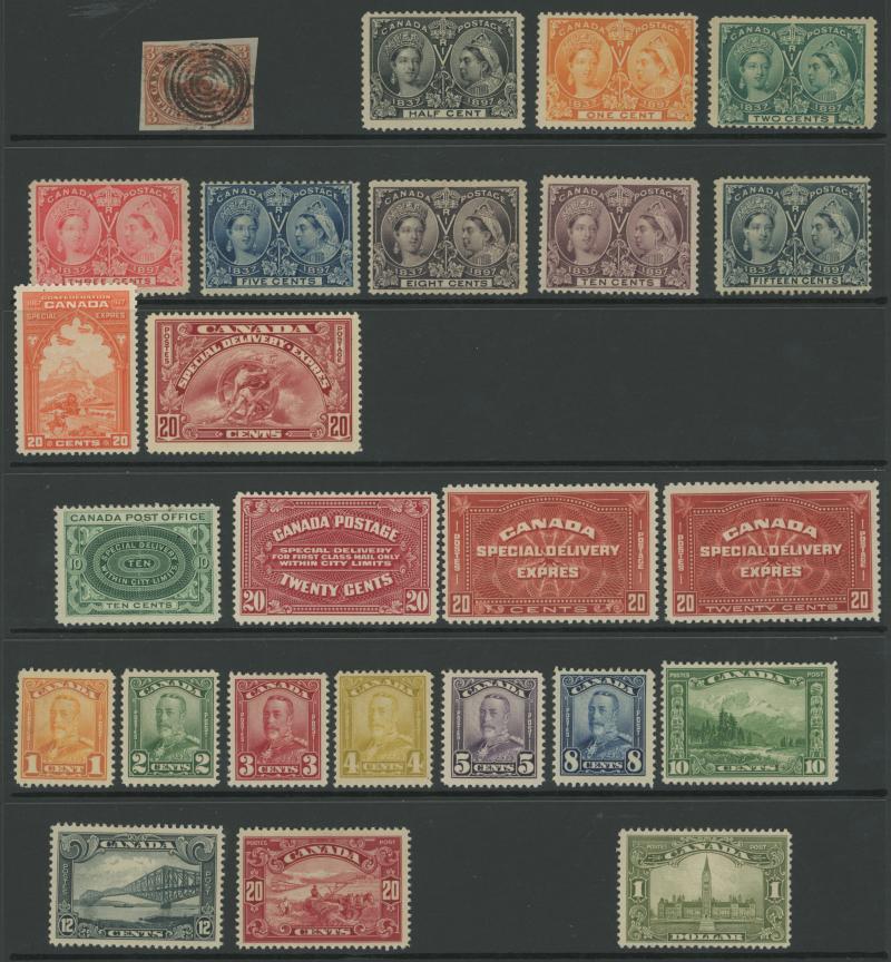 x2 one with light indistinct cancel & a couple of tiny shallow thins, the other very fine with bold target cancel, then 1897 QV Jubilee short set ½c black to 20c vermilion *, 1928-29 KGV Heads & Pictorials set * including 50c 'Bluenose' schooner, and