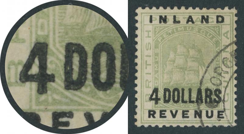 1888-89 'INLAND/REVENUE' Surcharges on Revenues '4 DOLLARS' green with Large '4' (Taller than Letters) SG 188a, a little faded,