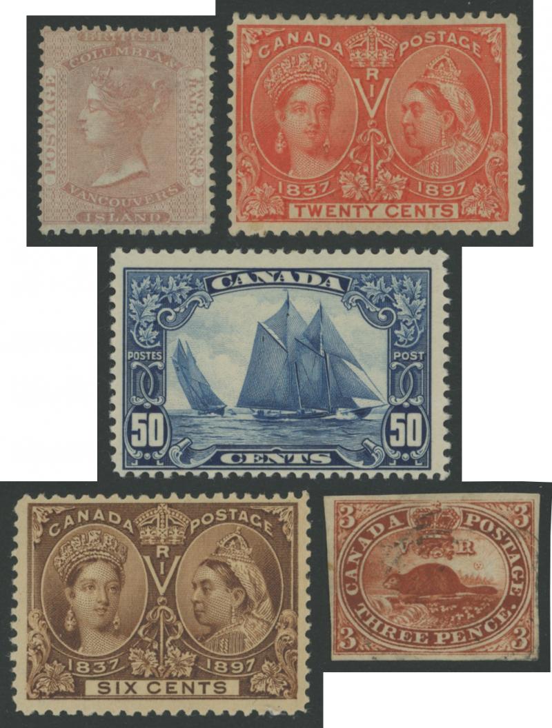 Small selection comprising British Columbia & Vancouver Island 1860 2c pale rose *, Colony Imperf 3d Beaver used with full margins
