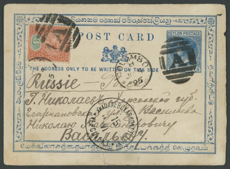 1895 usage of 2c Postal Card to Russia uprated with Tablets 3c and 'COLOMBO / B / A ' duplex, very fine Cyrillic arrival cds on the