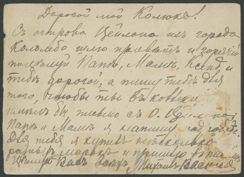 face, two minor repaired tears at the base, the address and message in Russian. (Image1) (Image2)