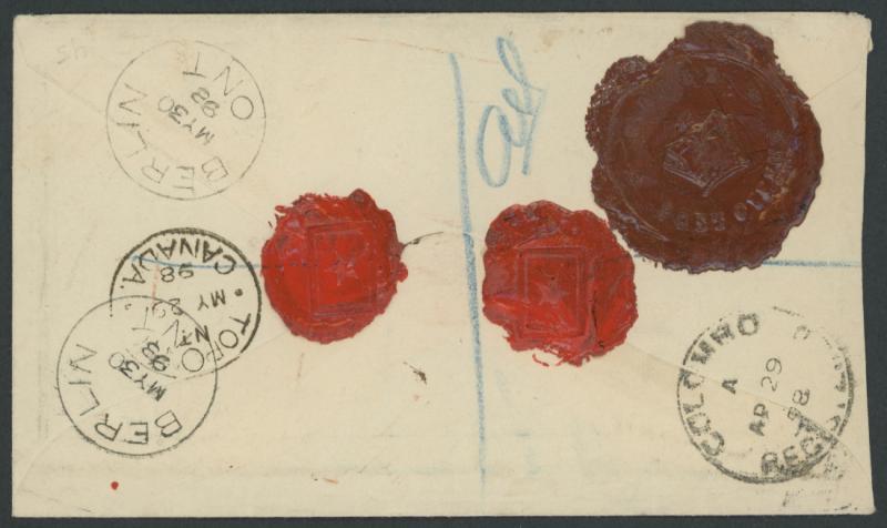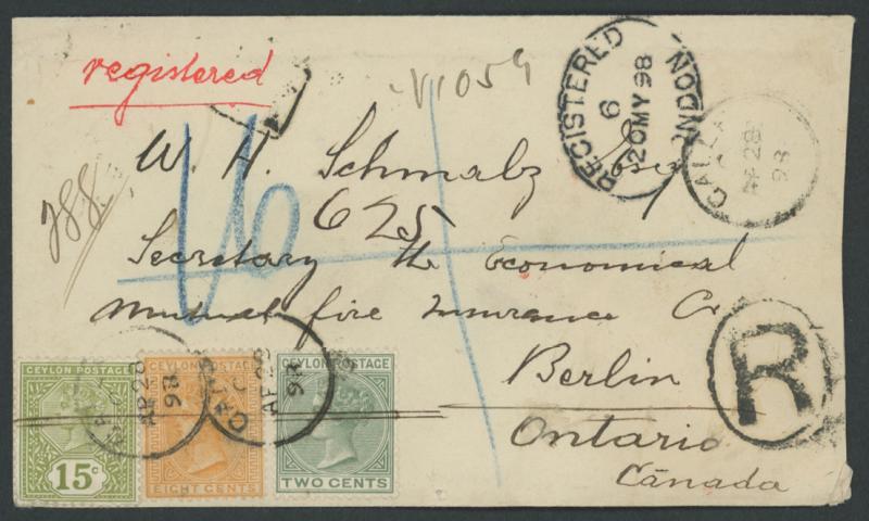 impressed in red wax on the reverse, to "Berlin/Ontario/Canada" with 'R'-in-oval & 'COLOMBO/REGISTERED' backstamp plus transits of London GB (on the face) and 'TORONTO' and 'BERLIN/MY30/98' arrival. Ex Ted Proud. (Image1) (Image2)