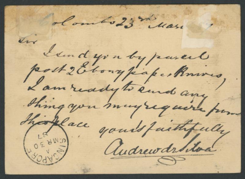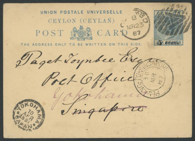 mailboat sorter cds & 'SINGAPORE/ A /MR30/87' backstamp, redirected to "Yokohama", Japan with very fine strike of 'YOKOHAMA/ 10/APR/1887/JAPAN' tiny 20mm arrival cds on the face, minor blemishes on the reverse. The addressee, Paget Jackson Toynbee,