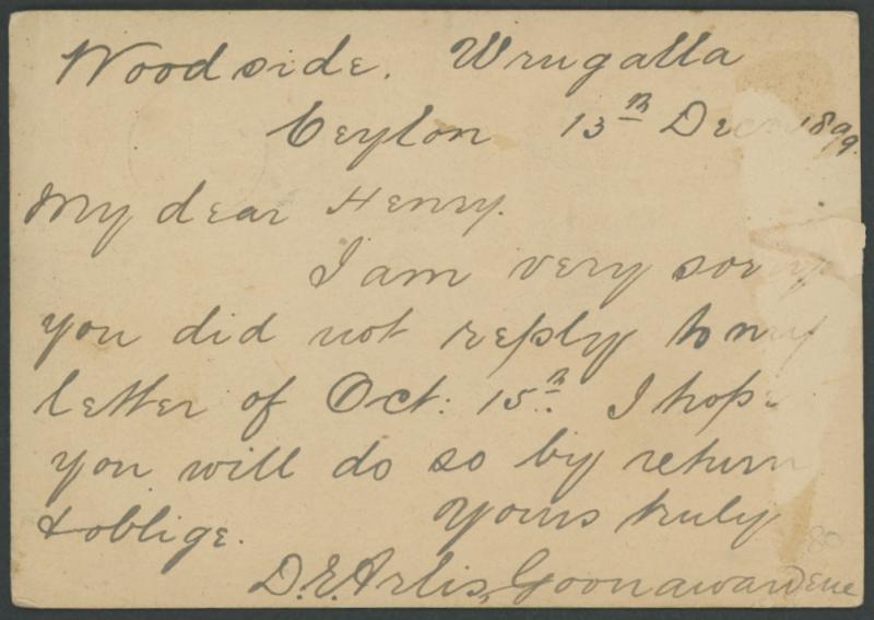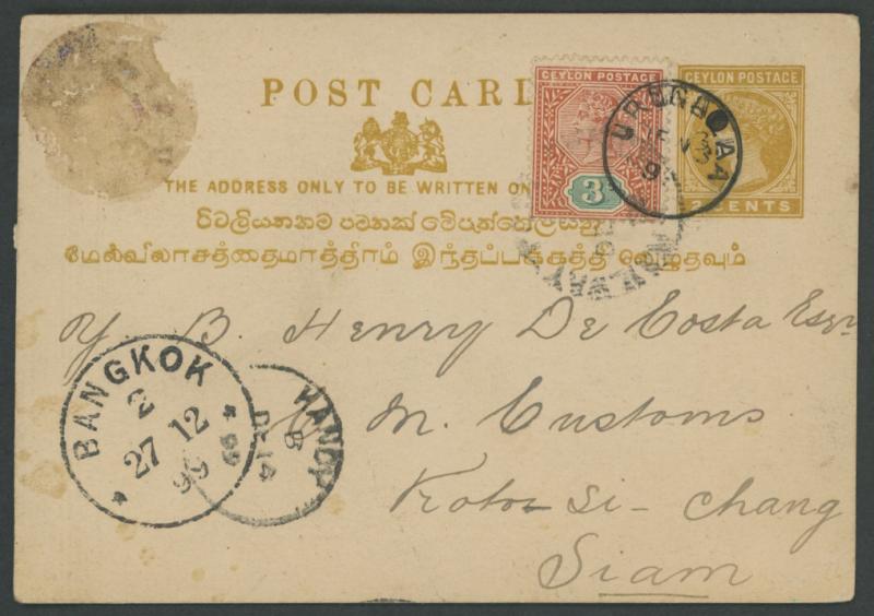 1899 (Dec 13) social usage of QV 2c olive Postal Card with message headed "Woodside Urugalla", to "HM Customs/Koh-si-chang/Siam",