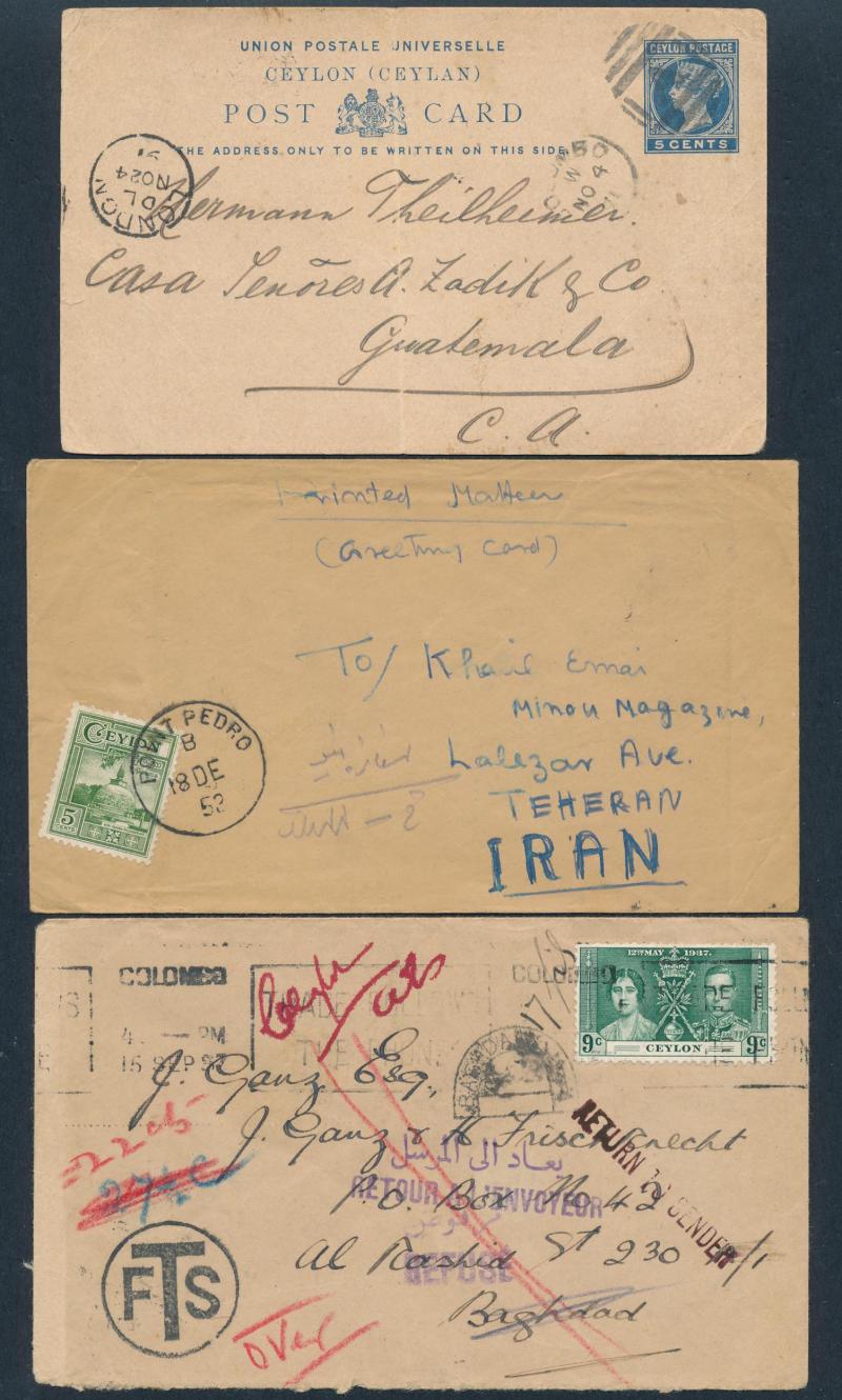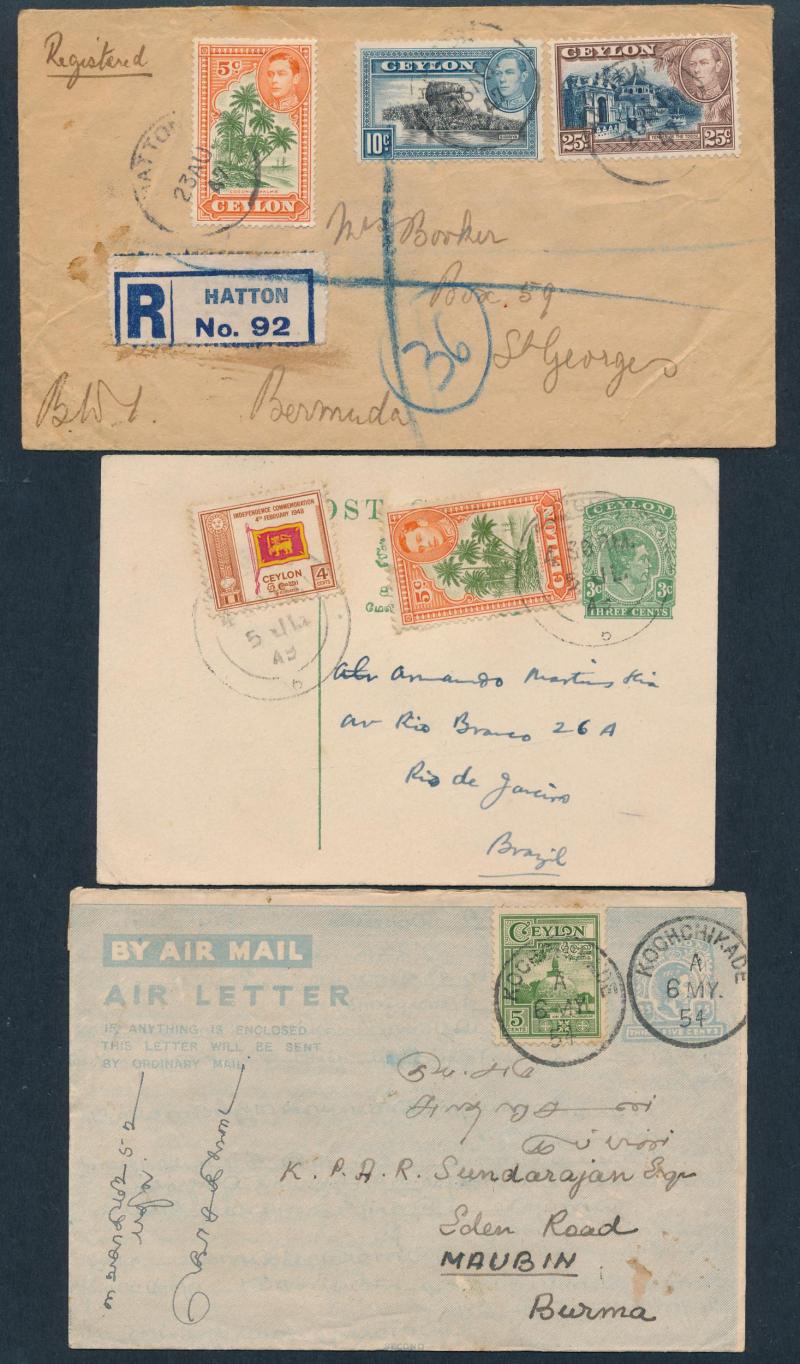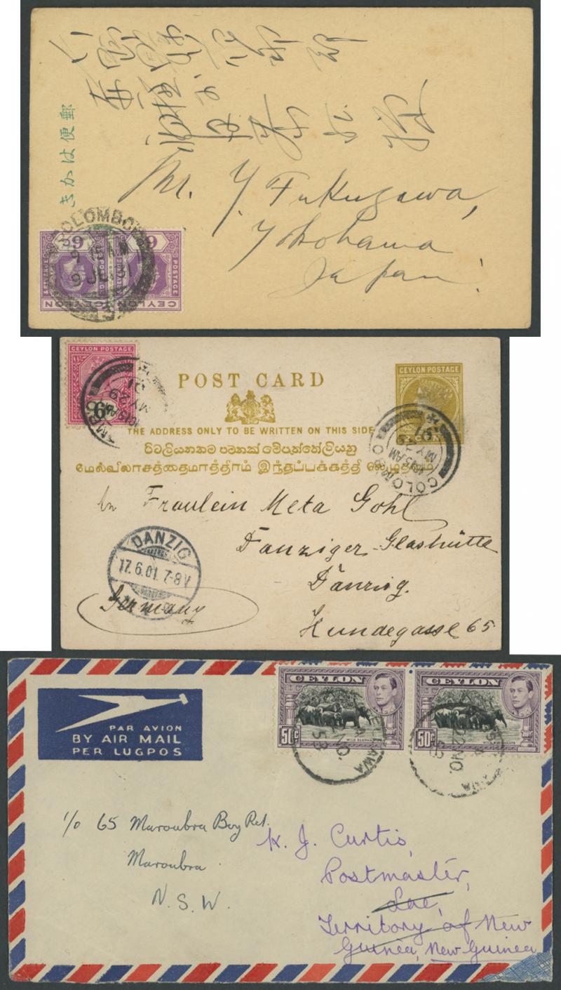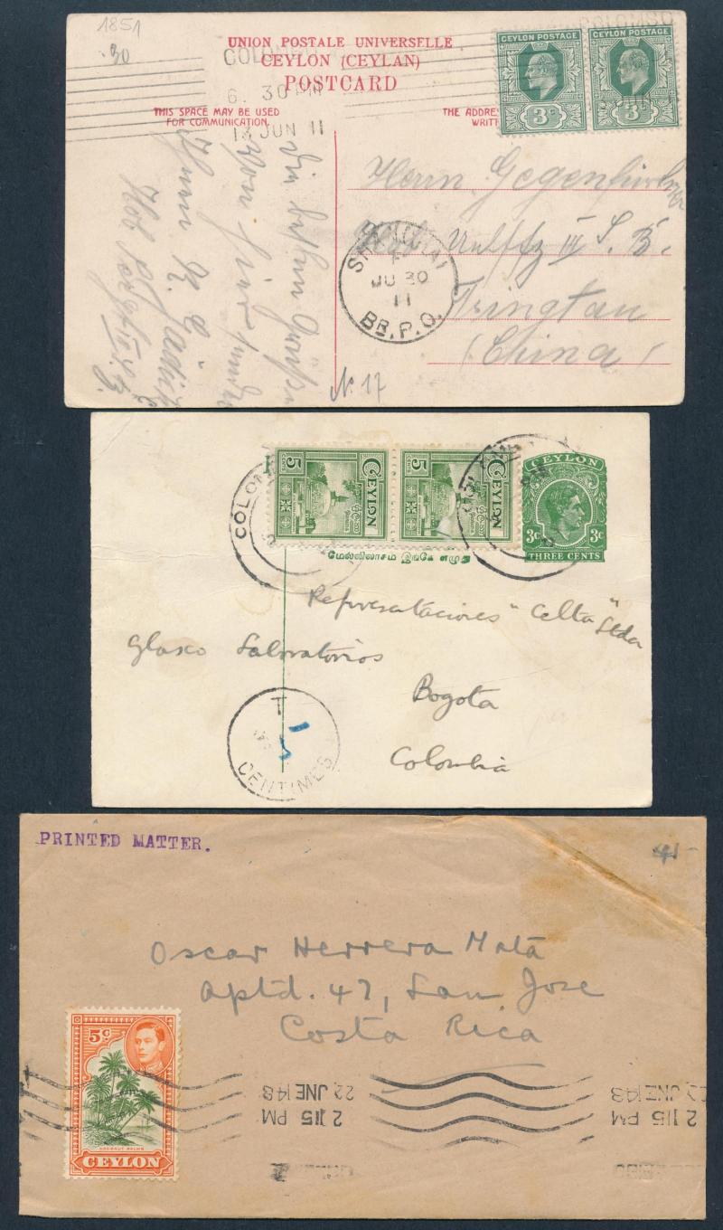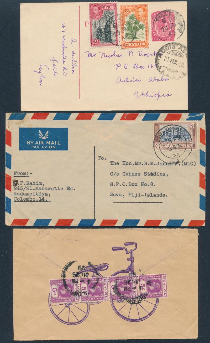Czechoslovakia (1927, advertising) and Malta (1947); Postal Cards to Bermuda (1936), Brazil (1949), Colombia (1954), Danzig (1901), Egypt (1950), Ethiopia (1949), Guatemala (1891, heavy crease), Japan (1931, Ceylon stamps on Japanese card) and