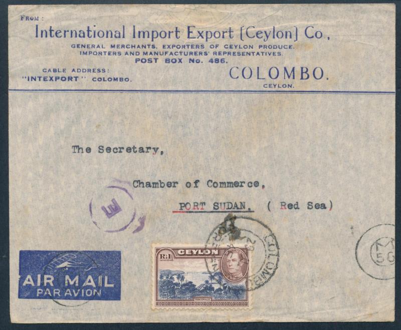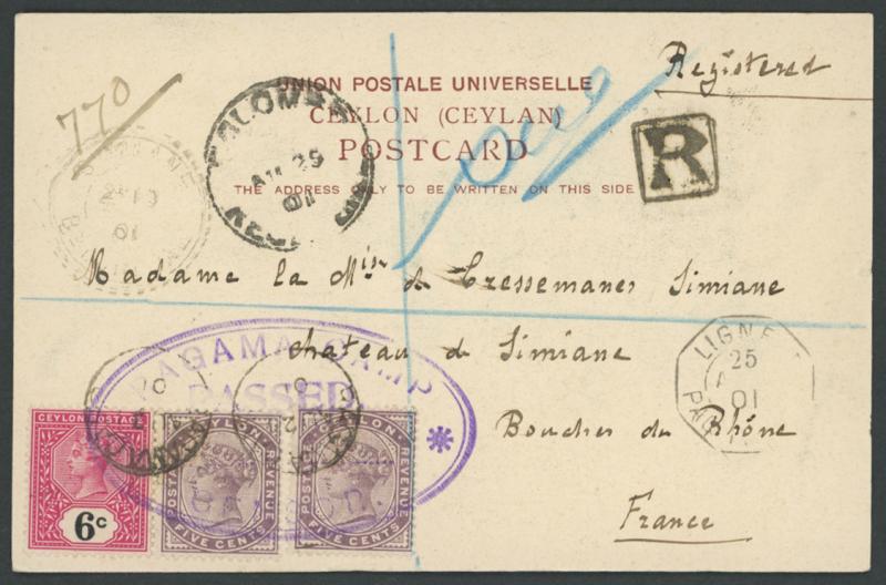 Simiane/Bouches du Rhone/France" with QV 5c x2 & 6c tied by 'RAGAMA CAMP' cds and the huge oval 'RAGAMA CAMP/PASSED/CENSOR' cachet in violet, Colombo cds & 'R'-in-box cachet, partial French mail-sorter and faint 'SIMIANE' arrival cds, the brief