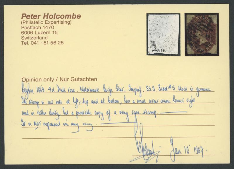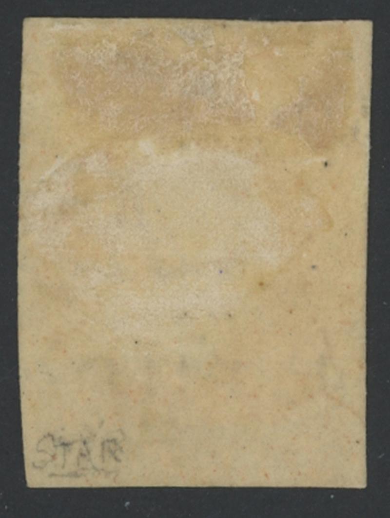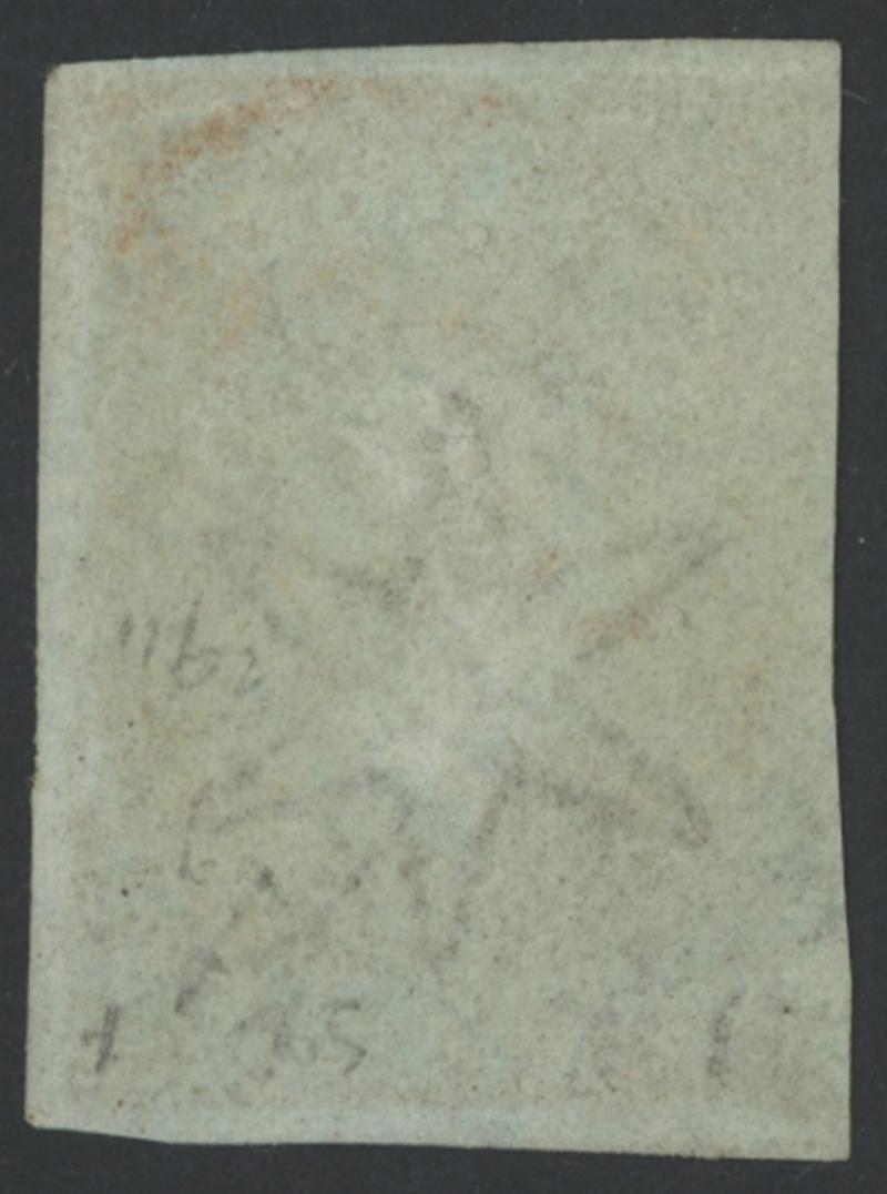impinges on the design, margins otherwise just shaved to good, small corner crease at lower-right and a bit soiled, bars cancel, Cat £4500. A presentable example of this rare stamp. Peter Holcombe Certificate (1987) states "...It is NOT repaired in