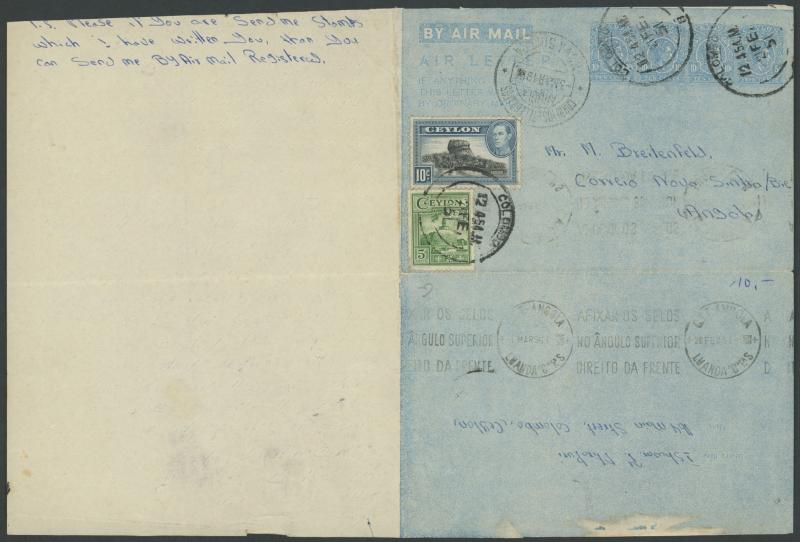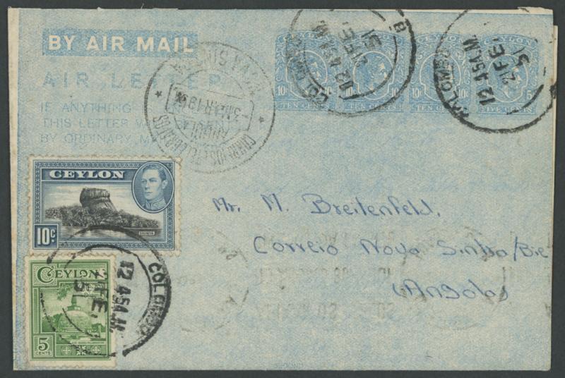 1951 usage of KGVI 5c+10c+10c+10c+10c Aerogramme to Angola uprated with 10c Sigiriya & 5c Dagoba tied by 'COLOMBO' cds,