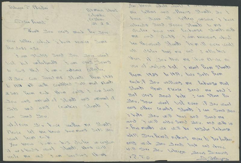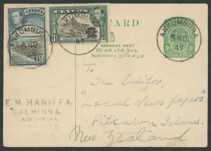 3c Adam's Peak & 6c Harbour tied by superb 'ANKUMBURA' cds, the message seeks penpals on Pitcairn. Ankumbura is a village in the Central Highlands about 15km due N of Kandy. (Image1) (Image2)