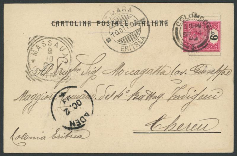 Souvenir of the Expedition to China...Greetings from the Steamship 'Minghetti') to "Cheren/Colonia Eritrea" with QV 6c tied by Colombo cds, transits of 'ADEN', 'MASSAUA' (squared-circle) & 'ASMARA/10OTT03/ERITREA' all on the face. A lovely item to a