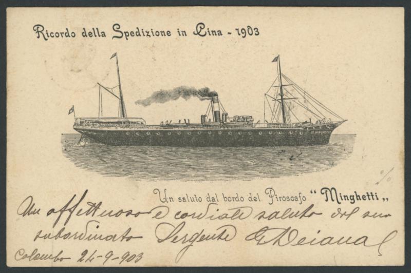 1903 (Sep 24) usage of Italian 'Ricordo della Spedizione in Cina 1903/[ship]/Un saluto dal bordo dal Piroscafo Minghetti' (=