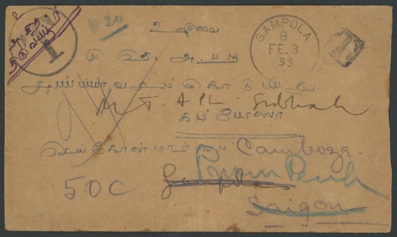1933 (Feb 1) stampless merchant's cover from South India to Cambodia addressed in Tamil & endorsed "Gampola" with very fine