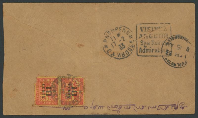 'GAMPOLA/FE3/33' arrival cds, redirected to "Saigon" and then to "Camboge/Pnom Penh" where Postage Due '10/CENTS' pair (faults) tied by Phnom Penh cds with very fine 'PNOMPENH/17-2/33/CAMBODGE - VISITEZ/ANGKOR/Ses Ruines/Admirable' alongside, light