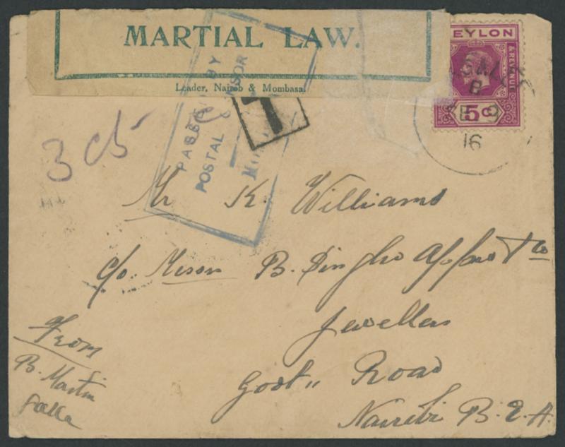 backstamp, scarce dull green/white 'OPENED BY CENSOR/UNDER/MARTIAL LAW' label with 'Leader, Nairob [sic] & Mombasa' imprint tied to the face by boxed 'PASSED BY/POSTAL CENSOR/Mombasa' cachet in blue, 'MOMBASA/9OC/16' arrival backstamp, a bit aged and