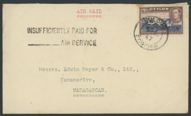 'INSUFFICIENTLY PAID FOR/...AIR SERVICE' cachet, just discernible Diego Suarez transit of '8/AVRIL/47' and fine 'TANANARIVE PP/21-5/47/MADAGASCAR' arrival backstamp. (Image1) (Image2)