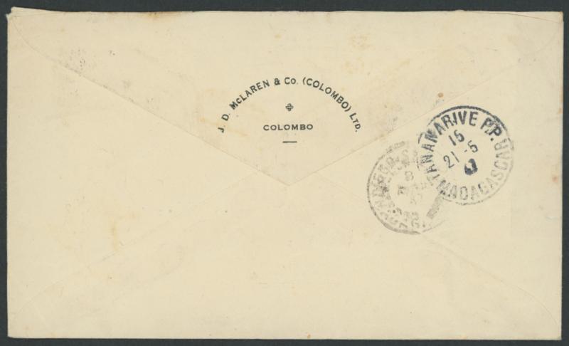 1947 (Feb 5) JD McLaren & Co (Colombo) cover to Tananarive, Madagascar with 1r tied by 'COLOMBO/ FOREIGN' cds and unusually fine