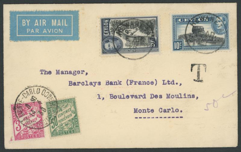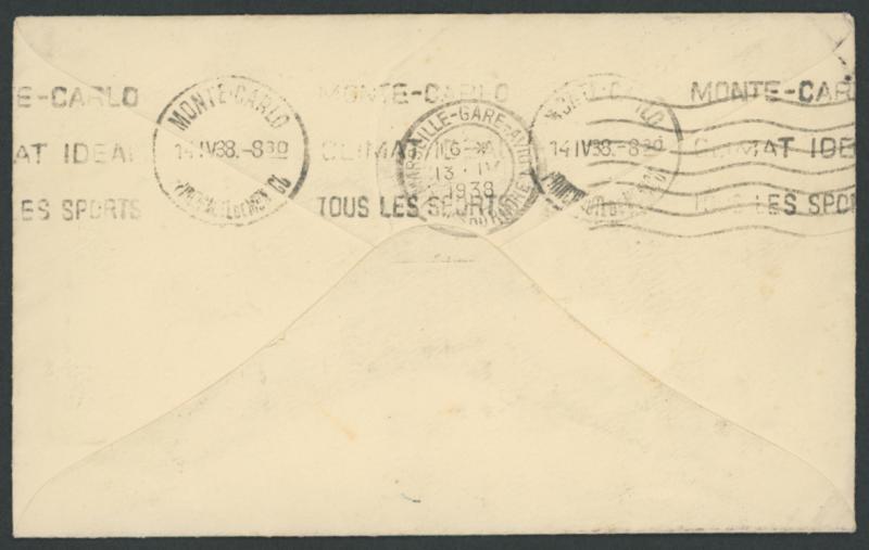 tied by very fine 'HEWAHETA' cds, very fine antique 'T' handstamp & endorsed "50c", Marseilles & Monte Carlo machine backstamps, Monaco Postage Dues 50c green & 3fr magenta tied by 'MONTE-CARLO/14 4/38/PRINCIPAUTE-DE-MONACO' cds. (Image1) (Image2)
