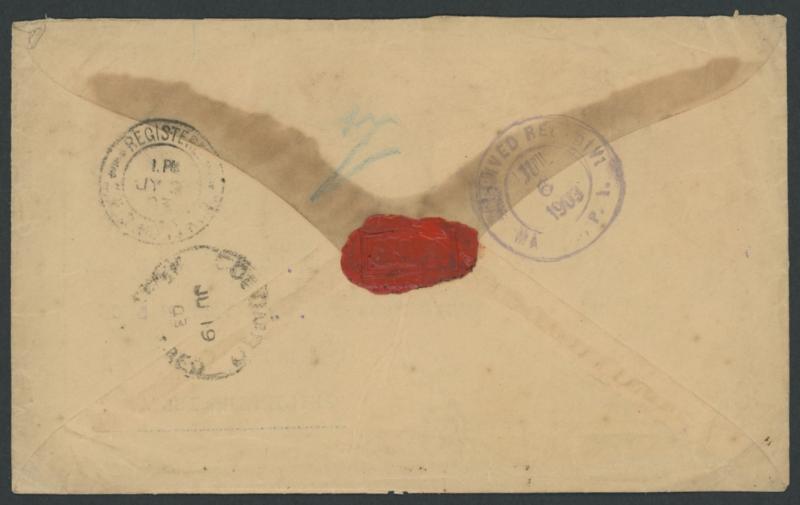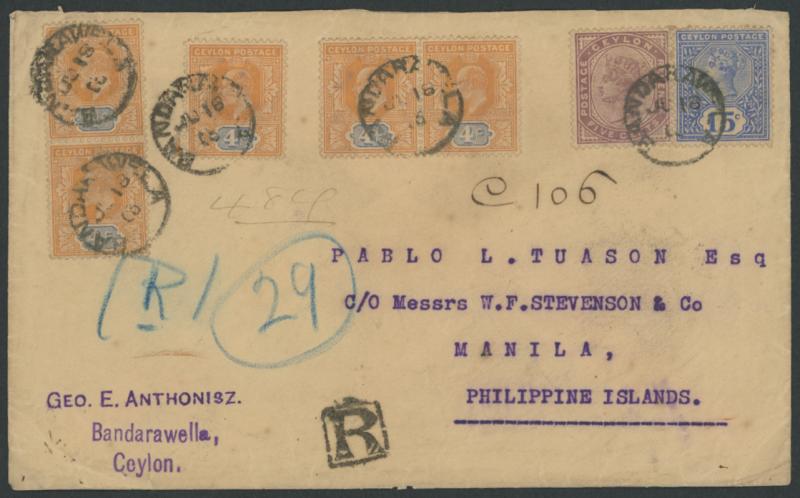 'BANDARAWELA' cds (one 'L'), boxed 'R' cachet & three registration endorsements, the reverse with transits of Colombo and Hong Kong (?) plus American-pattern rubber 'RECEIVED REG DIV/JUL/6/1903/MANILA PI' arrival in violet, a bit aged. Bandarawela (=