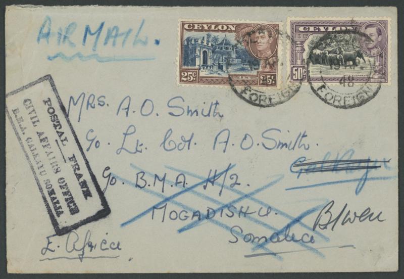 Military Administration) with 25c Temple and 50c Elephants tied by 'COLOMBO/FOREIGN' cds, redirected to "Galkayu" then to "B/weu" (?) with very fine boxed 'POSTAL FRANK/CIVIL AFFAIRS OFFICE/BMA GALKAYU SOMALIA' (not previously seen by us), the