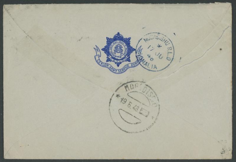 1948 (Apr 19) airmail cover with Ceylon Army Service Corps badge on the flap to an officer at "Mogadishu/Somalia" (under British