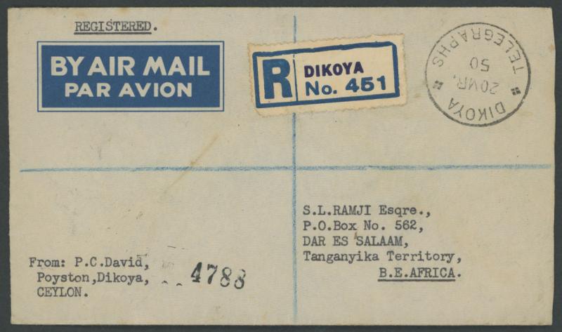 Temple tied to the revese by the rare 'DIKOYA/TELEGRAPHS' cds (unlisted by both Ted Proud and David Horry) with a superb strike on the face alongside blue/white R label, 'NAIROBI/REGISTERED' and double-oval 'DARESSALAAM/26MR/ 1950/REGISTERED' (one