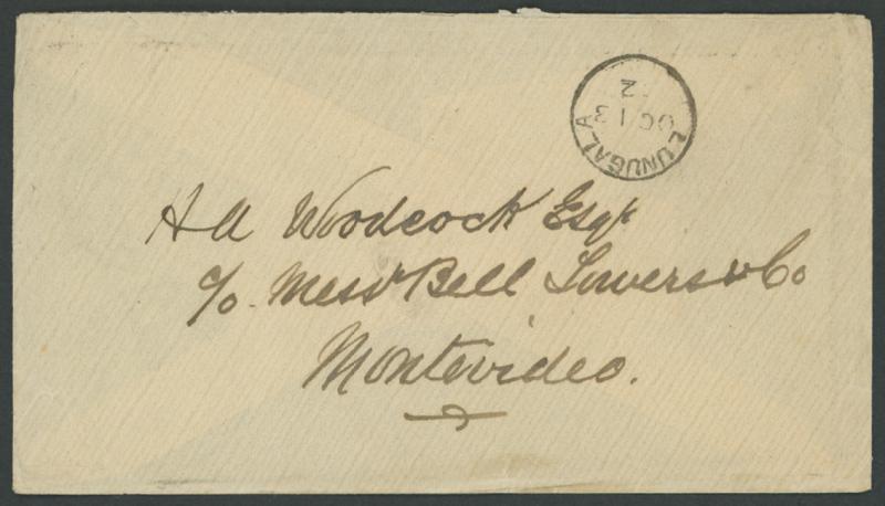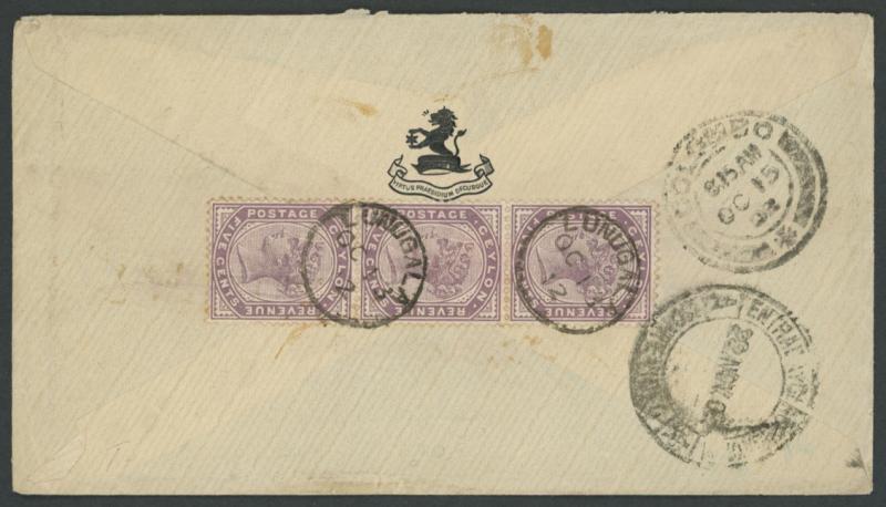 Montevideo, Uruguay with QV 5c strip of 3 tied to the reverse by very fine 'LUNUGALA' cds (another superb strike on the face), smudged arrival backstamp of '22NOV02'. Lunugala is in Uva Province, 150km E of Colombo, but some 350km by road along the