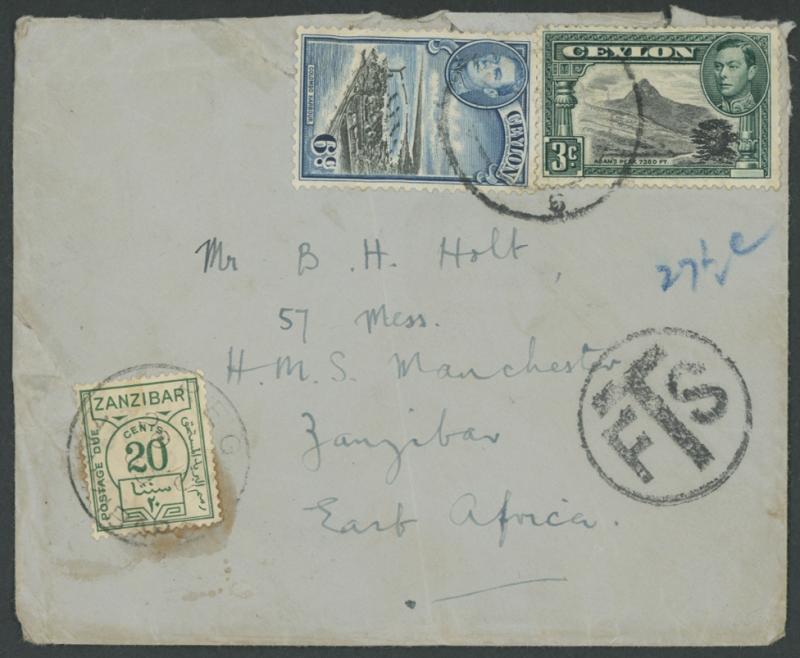 1939 (June) social cover to "57 Mess/HMS Manchester/Zanzibar/East Africa" with KGVI 3c & 6c but apparently overweight with very