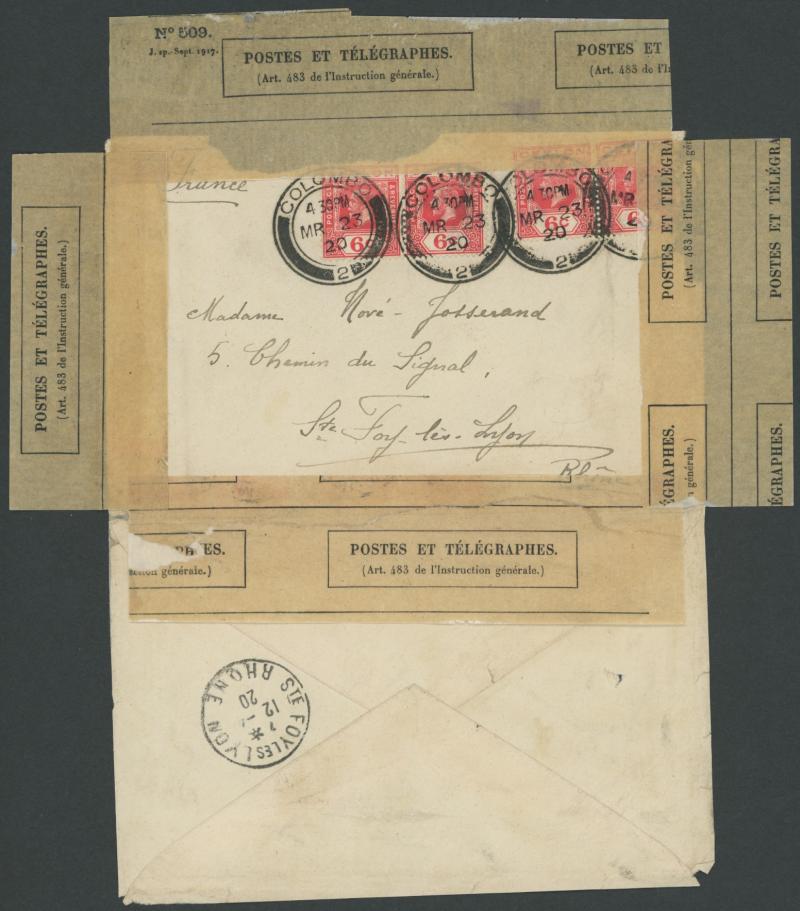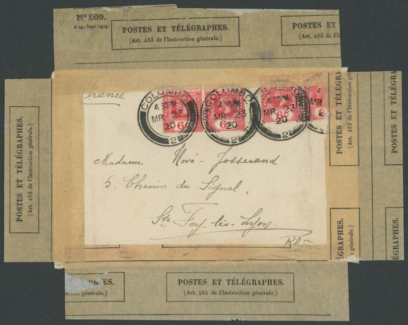 1920 (Mar 23) cover to France with KGV 6c rose x4 tied by superb 'COLOMBO/ 2 ' cds, roughly-opened in transit and resealed on all