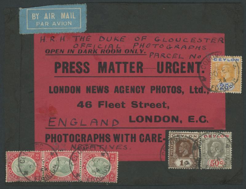 black/red parcel label endorsed "H.R.H. THE DUKE OF GLOUCESTER/OFFICIAL PHOTOGRAPHS/NEGATIVES", airmail to England with KGV 1c, 25c, 50c and 2r green & red/yellow vertical strip of 3 (one unit affixed across wrapping join with small blemishes) tied