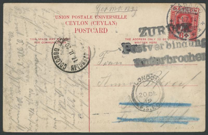 London '20DE/19' cds and 'COLOMBO/17.11.20/RETURNED LETTER OFFICE' cds on the face, a few minor transmission marks. (Image1) (Image2)