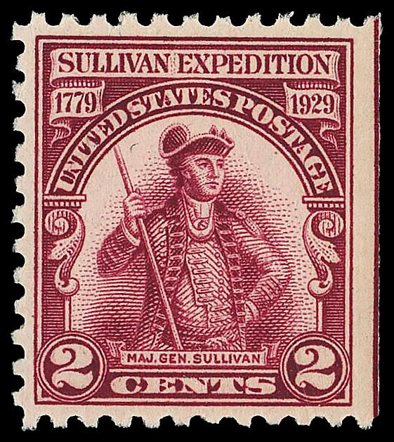 1929, 2¢ Sullivan Expedition, lake color error (Scott 657a), right margin single with guide line, o.g., never hinged, Very Fine, with 2001 P.S.E. certificate for strip. Scott $625.....Suggested Bid $500