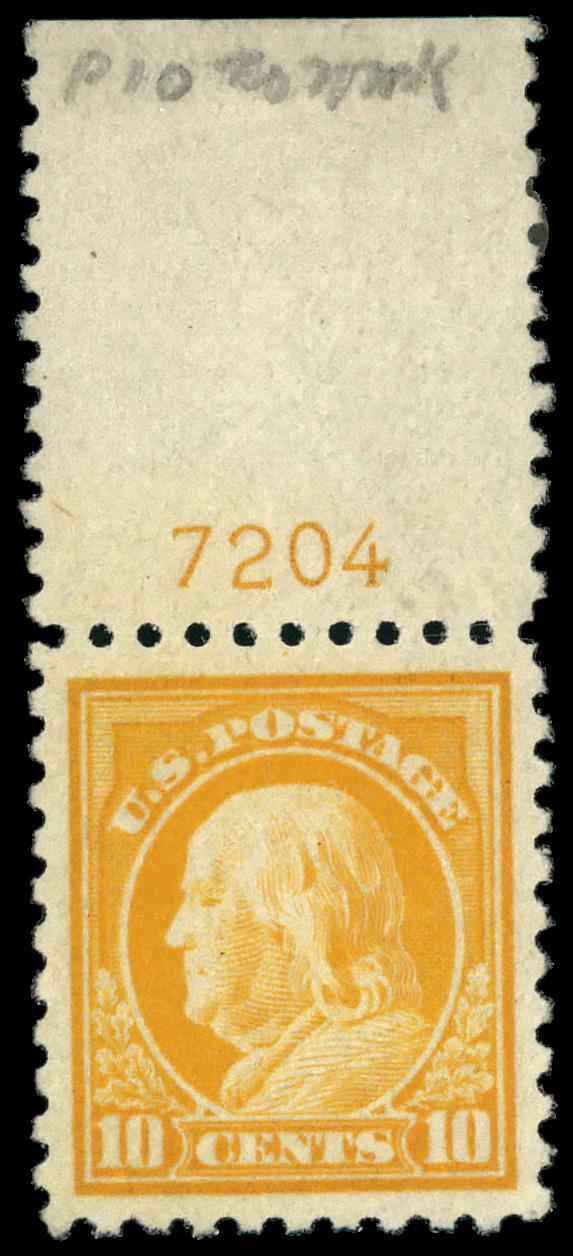 1916, 10¢ orange yellow, unwatermarked, perf. 10 (Scott 472), plate number single, o.g., stamp never hinged, hinged in selvage only, jumbo margins, Extremely Fine.....Suggested Bid $550