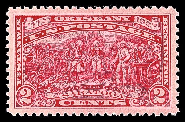 1927, 2¢ Burgoyne (Scott 644), o.g., never hinged, a gorgeous stamp with captivating, brilliant color, clear impression, and exceptional centering, Superb, with 2025 P.S.E. certificate graded SUP 98. SMQ SUP 98; $165.....Suggested Bid $165