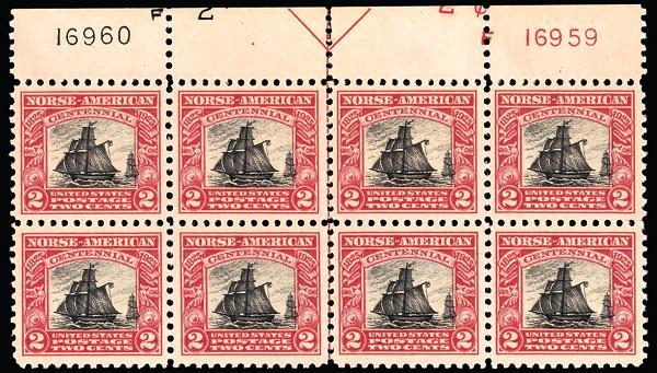 1925, Norse-American complete (Scott 620-621), set of 2, plate blocks of 8, o.g., never hinged, Extremely Fine. Scott $975.....Suggested Bid $725