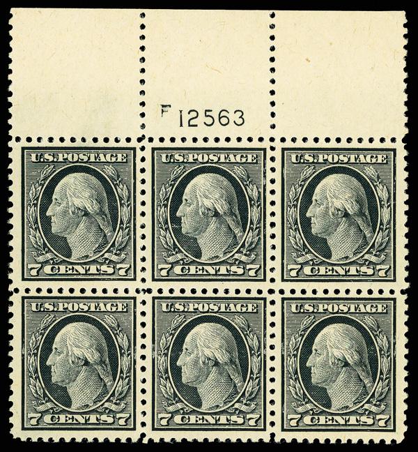 1917, 7¢ black, perf. 11 (Scott 507), top margin plate block of 6, Well-centered layout, o.g., never hinged, Very Fine. Scott $450.....Suggested Bid $400