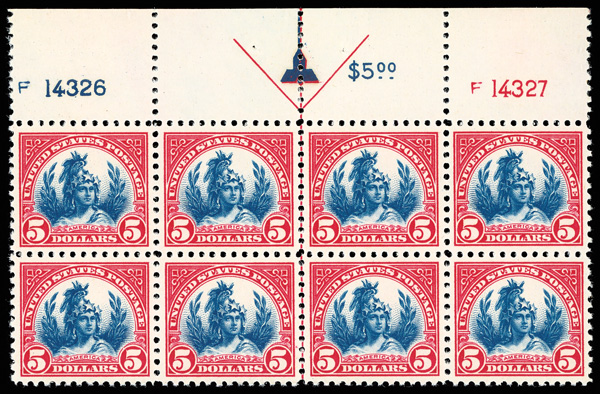 1923, $5 America (Scott 573), wide top margin plate number F14326 - F14327 block of 8 with arrow, o.g., never hinged, an exceptional plate with unparalleled color, centering and selvage, Extremely Fine, ex Cheyney, Gross. Scott $2,600.....Suggested Bid $2,000