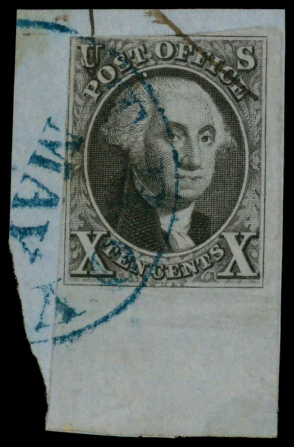 1847, 10¢ black (Scott 2), tied to piece, blue cds, Fine. Scott $900.....Suggested Bid $500