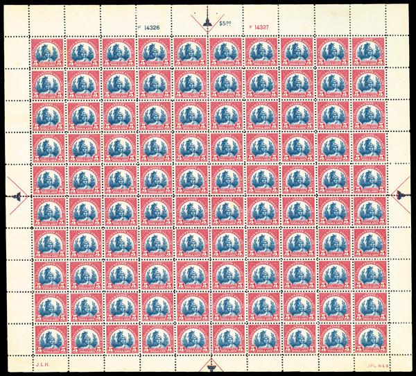 1923, $5 America (Scott 573), top right full pane of 100 with plate number F14326 - F14327, o.g., never hinged, wonderfully fresh and sound, with bright colors in near-perfect registration; light natural gum wrinkles, Fine to Very Fine with better, with 2024 P.S.E. certificate. Scott $20,840 as plates & singles.....Estimate $15,000-20,000