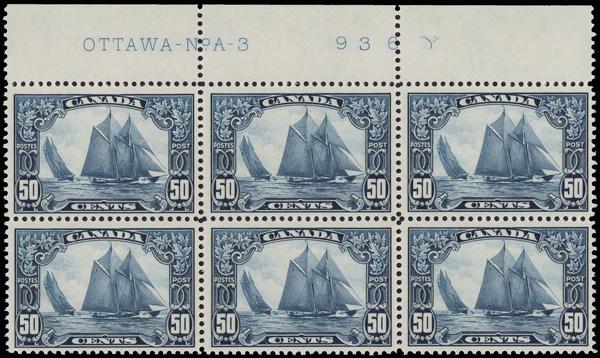 Lot 121 - 1929, 50¢ Bluenose (Scott 158), an immaculate Plate No.A-3 block of 6, o.g., never hinged, wonderfully fresh and nicely centered, Very Fine.