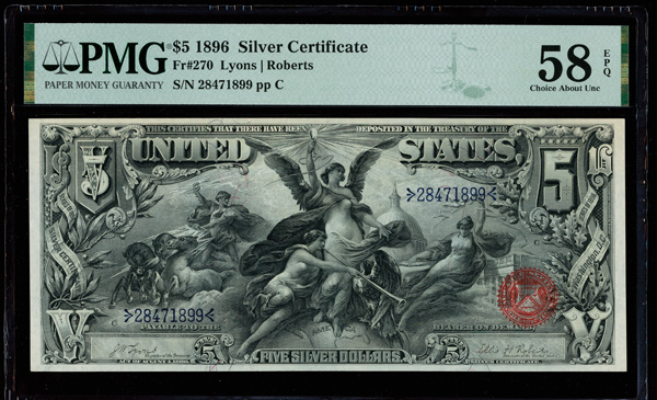 Fr. 270 1896 $5 Silver Certificate PMG 58 Choice About Unc EPQ (Fr-270), PMG graded Choice About Uncirculated 58.....Estimate $10,000-12,000