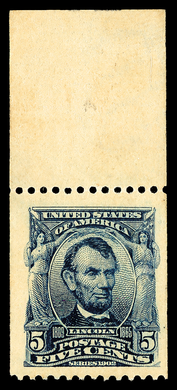 1908, 5¢ blue, experimental coil, perf. 12 horizontally (Scott 317), single with leader tab at top, o.g., very lightly hinged, extraordinary example of this rare coil single, with jumbo margins of epic proportions; a uniquely appealing opportunity to acquire a stunning example of this stamp—which is unlike anything we've ever encountered on this issue, Very Fine to Extremely Fine, SMQ for a 90 is $12,500, no stamps at this grade in PSE's Population Report, with just two grad....Estimate $7,500-10,000