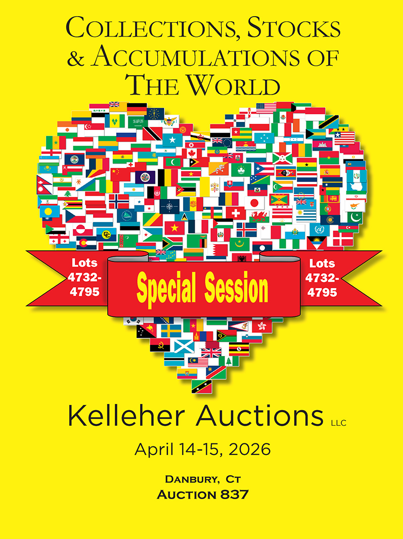 Nearly 800 lots from around the globe, offering dealers and collectors alike a bonanza of fresh material. US begins with well-filled collections of quality material, followed by numerous issue-specific holdings, strong Dealer's Stocks, and massive amounts of Face Value lots, along with Possessions and Postal History compilations. British Commonwealth runs Australia to Zanzibar, plus Commonwealth-wide and area collections, while British North America offers a wealth of Canada and Provinces. Worldwide spans Afghanistan to Vietnam, with general collections, regional holdings, strong Accumulations and Dealer's Stocks, as well as fun Topical collections following. We close the sale with a session of special items (Lots 4732-4795).