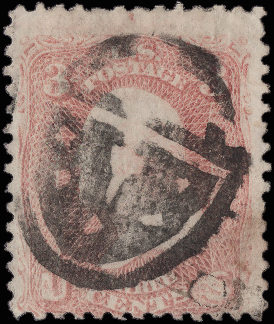on a Very Fine 3¢ rose (65); listed as a solid top by Skinner-Eno. A handsome, somewhat worn example of this rare Waterbury Shield. Rohloff Q-10. (Image)