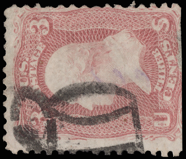 Small, Asymmetrical Design, clear strike in purple on a 3¢ rose (65) which